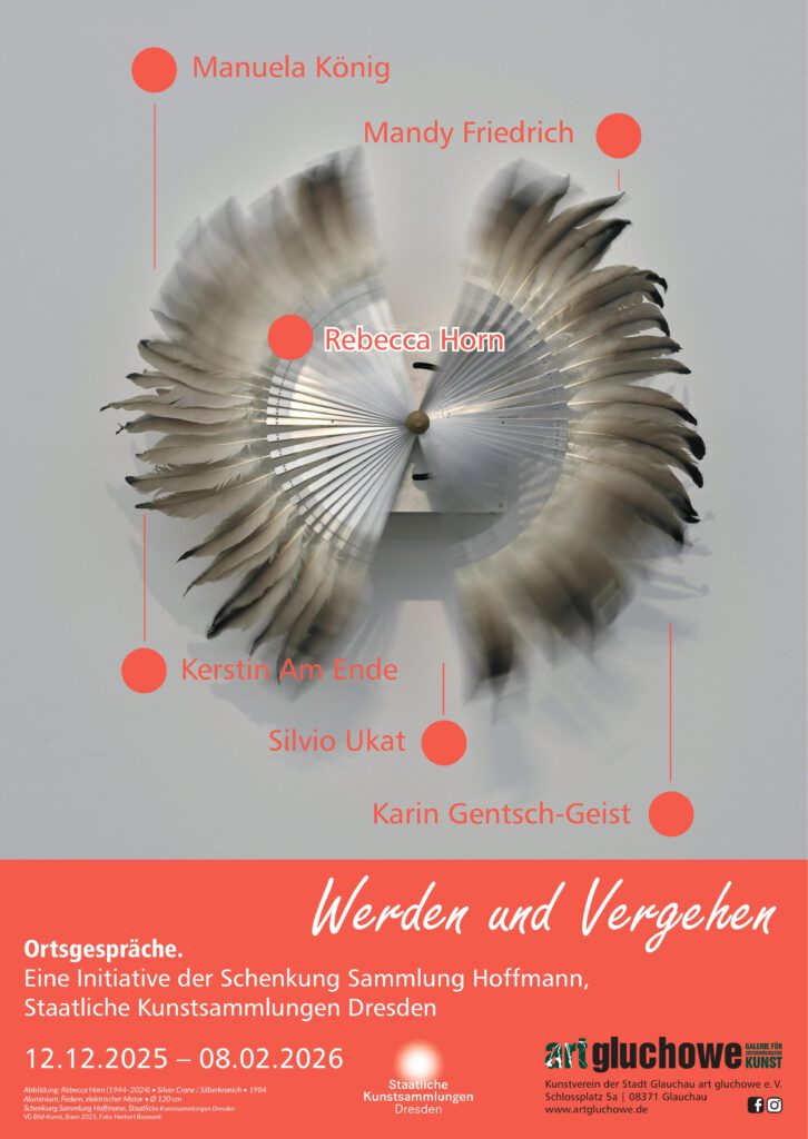 Diese Ausstellung aus der Reihe „Ortsgespräche. Eine Initiative der Schenkung Sammlung Hoffmann, Staatliche Kunstsammlungen Dresden“ zeigt das Werk „Silver Crane“ (1984) von Rebecca Horn als Ausgangspunkt für die Werke von: